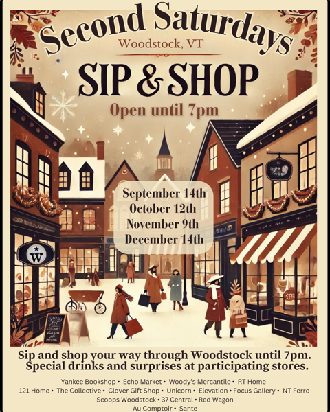 Sip and Shop your way through Woodstock until 7pm. Special drinks and surprises at participating stores. September 14th October 12th November 9th December 14th